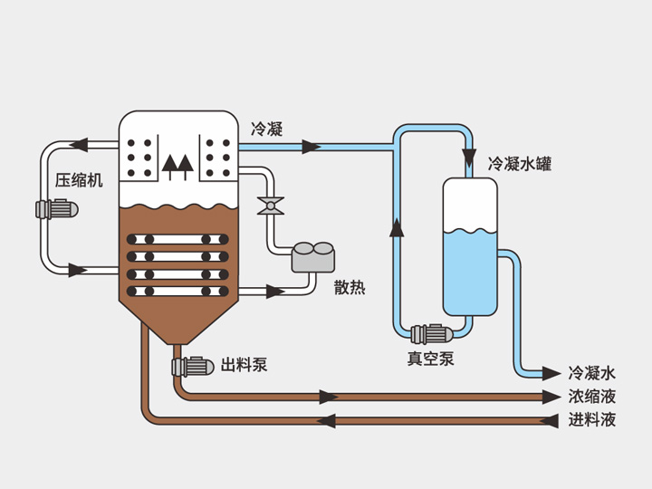 真空熱泵蒸發(fā)器利用真空泵使系統(tǒng)保持高真空狀態(tài),從而使料液沸騰的溫度降低到35-40°C之間,進(jìn)而增加傳熱效率及蒸發(fā)效果。